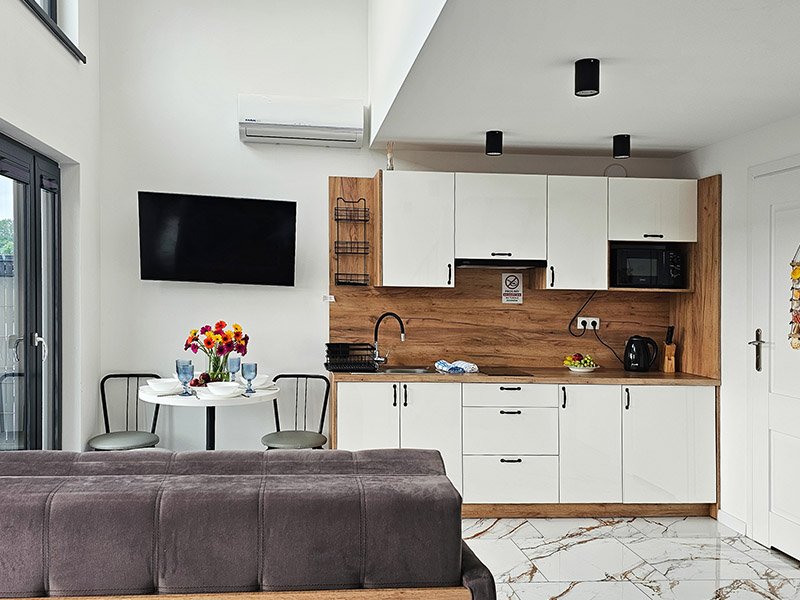 Pokój dzienny z aneksem kuchennym i rozkładaną kanapą