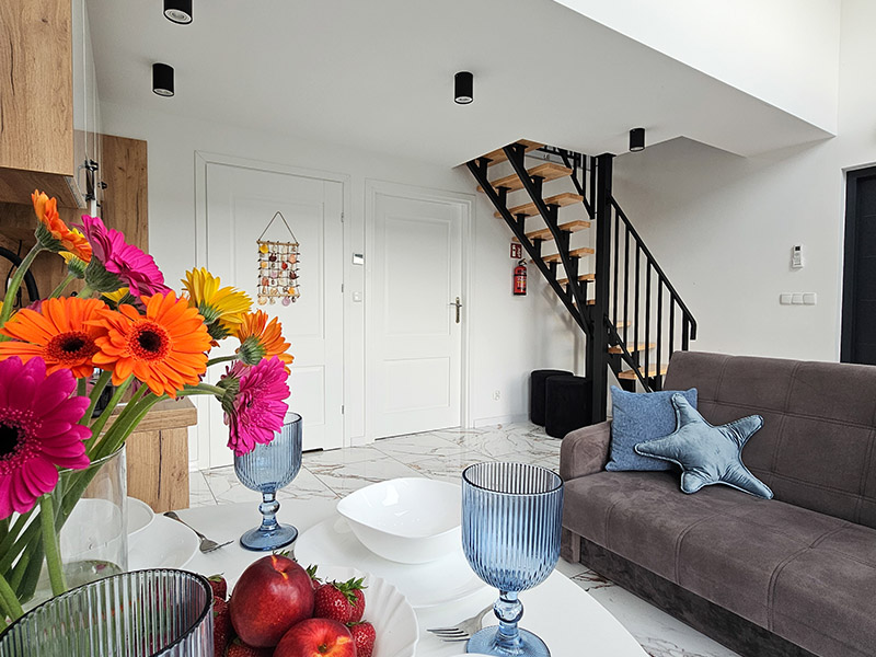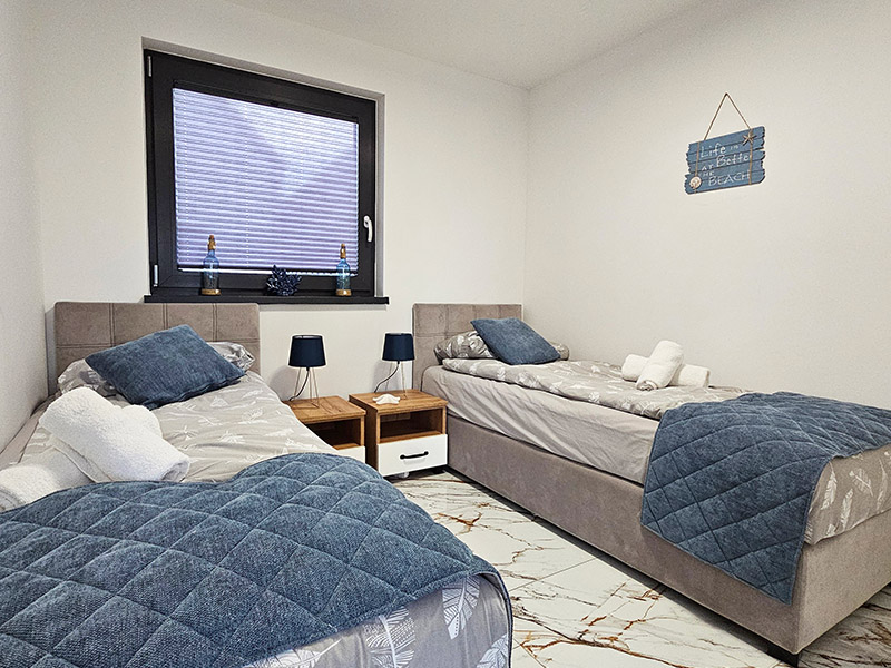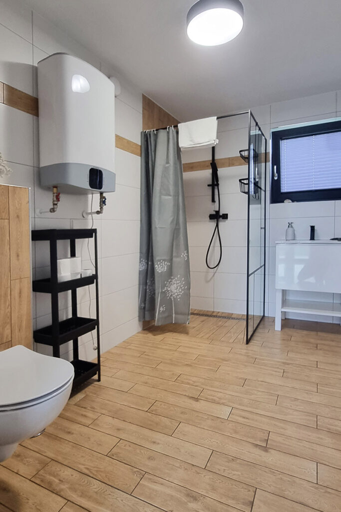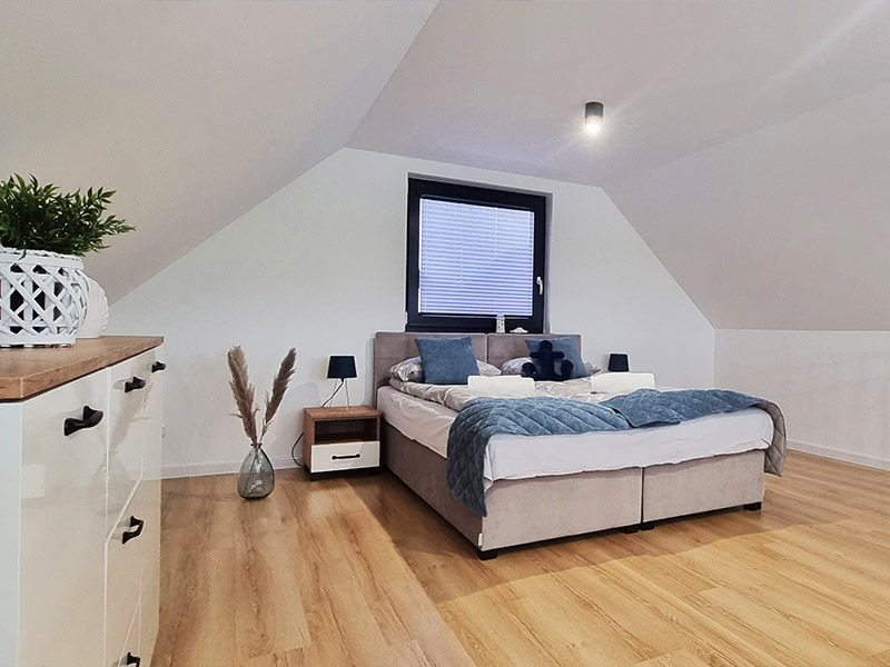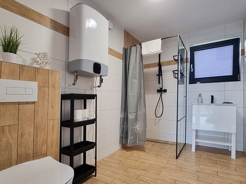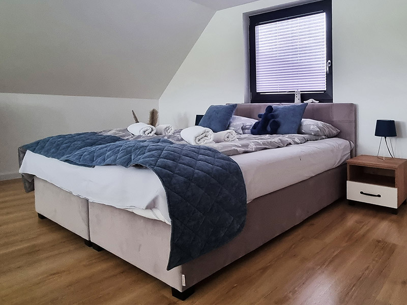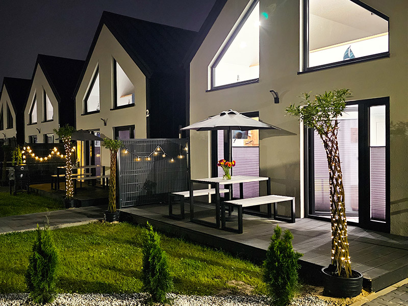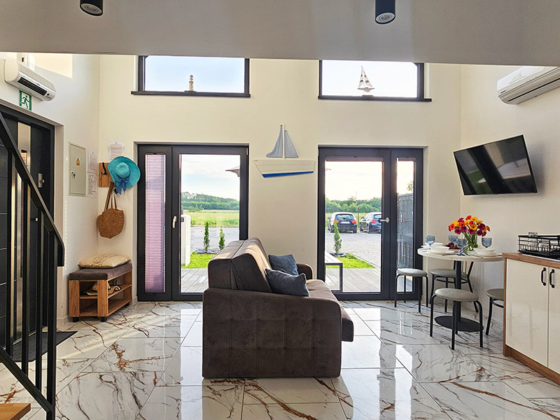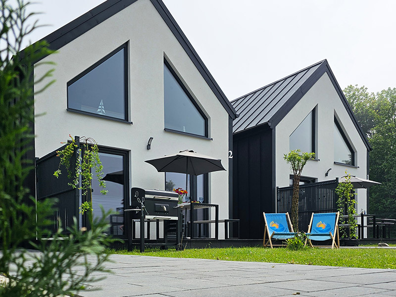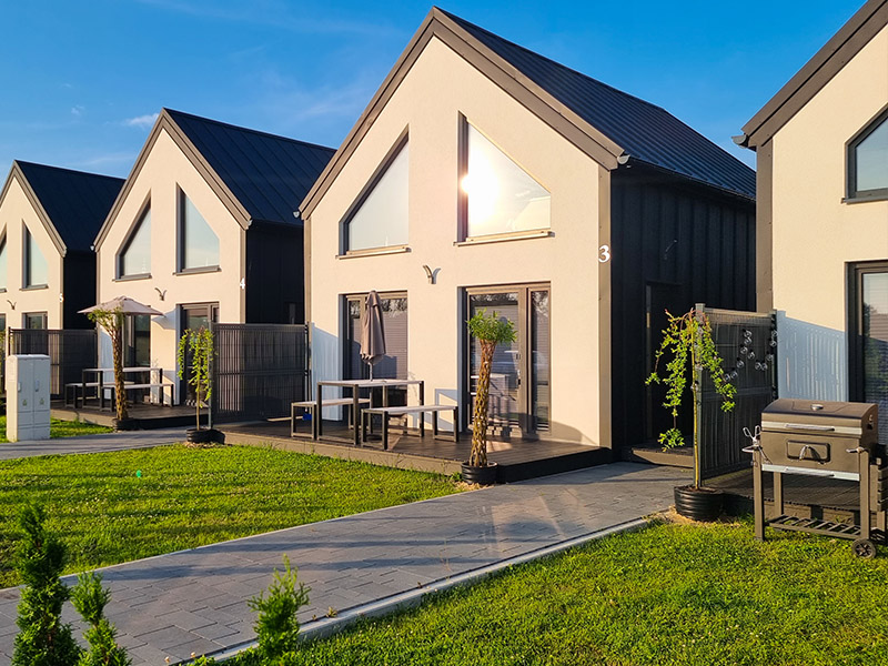 Nasze 14 klimatyzowanych domków zostało zaprojektowanych w stylu nowoczesnej stodoły, łącząc wygodę z wyjątkową estetyką. Wnętrza są jasne, przestronne, a dzięki dużym oknom wnętrza wypełniają się naturalnym światłem. Subtelne, niebieskie akcenty nawiązują do nadmorskiego klimatu, wprowadzając atmosferę spokoju i relaksu. W każdym domku znajdziesz: